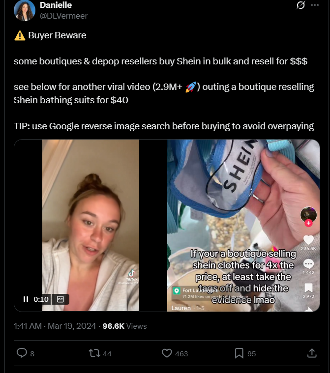 A X user posted about boutiques and depop resellers buying Shein products in bulk and reselling them. You can view the video here.